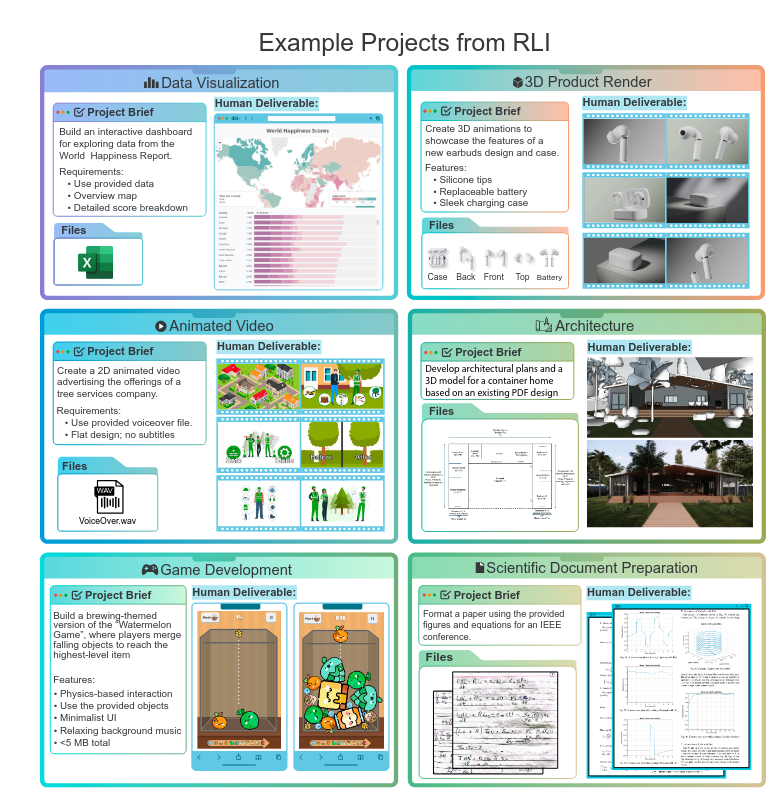 The Remote Labor Index (RLI) represents a broad range of projects from across the remote labor economy, including game development, product design, architecture, and data analysis. All projects represent real work that was performed by human professionals.