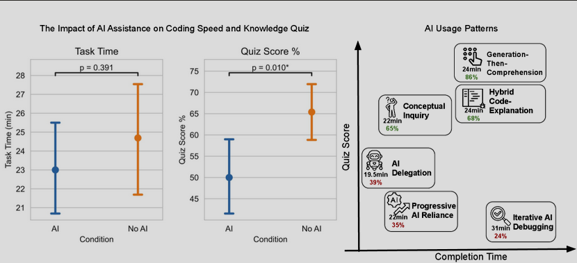 "How AI Impacts Skill Formation" reveals a significant decrease in library-specific skills (conceptual understanding, code reading, and debugging) among workers using AI assistance for completing tasks with a new Python library. (Right) We categorize AI usage patterns and found three high skill development patterns where participants stay cognitively engaged when using AI assistance.
